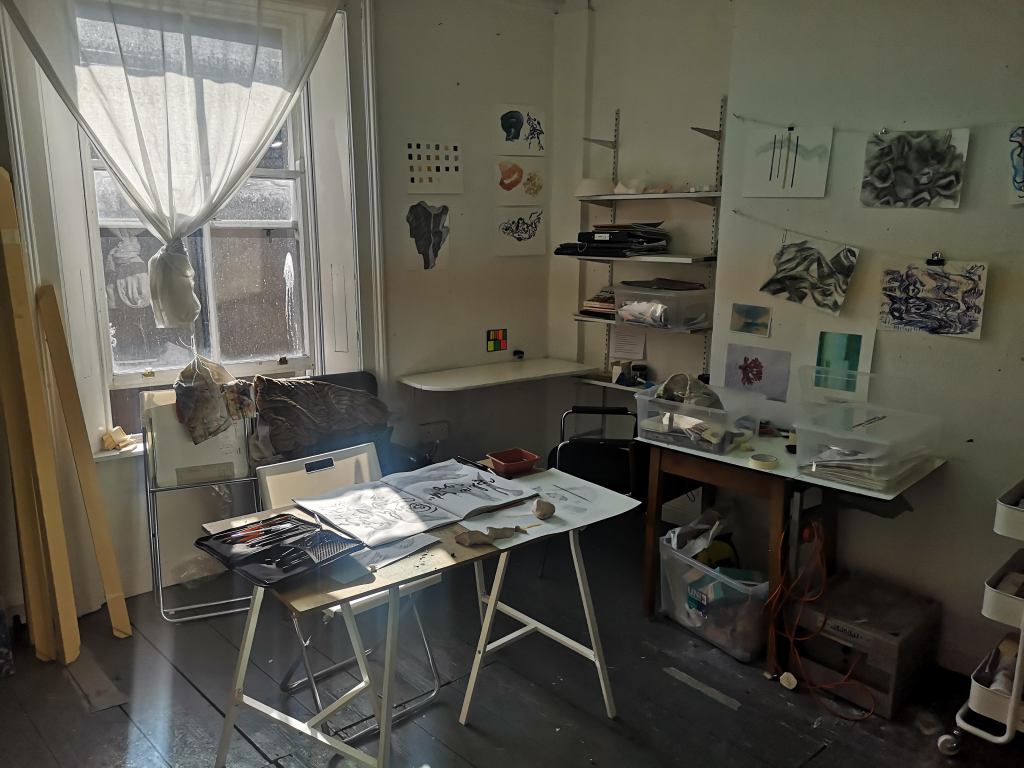 It is a white-ish room with four walls, a little under 4 square metres perhaps. It has a door with a lock, a large sash window with a small black leather armchair in front, a slab coming out from the wall to the right of the window which serves as writing desk, shelves above (piles of old notebooks, statements from exhibitions) – the research corner. It has an extendable table with piles of watercolour tubes, scraps of sandpaper and normal paper, a couple of notebooks, and research images pinned to the wall above (currently japanese scrolls and rain-sculpted limestone), then an easel, a storage trolley with three levels (brushes, paint-tubes, miscellaneous), a second trolley with a slab of perspex across the top (palatte), and bottles of mediums and white spirits on the level below. Then the largest wall hung with partially-finished paintings, stretched linen canvases leaning below. The wall paper, which I painted white, is patterned with bumps and ridges, which always show through when I make large drawings against the wall. There is a slab of metal in the floor against the opposite wall (under the extendable table), where there was once a fireplace. I can peer down between the large gaps in the old, uneven floorboards (painted grey), where I’ve lost many nails. My studio is up three flights of rickety stairs that gradually narrow as your ascend, a Victorian-era building I think. There is a comforting musty smell as soon as you enter downstairs, which is replaced by the sharp tang of white spirits, or the smoother aroma of linseed oil when you reach my studio, always slightly out of breath from the stairs. In the afternoon the sun circles around and shines through the sheer, gauzy hanging in my window, casting delicate gold patterns across my reference images and partial-paintings. This is when I sit the black armchair and do little more than watch the light, and take photos on my phone, sometimes post to my instagram story, always captured by the prettiness. This is the room where I slowly move towards making an artwork, where I read and make notes, where I drag pastels and ink across notebook pages, where I hammer together canvas bars, boil rabbit skin glue on my hot plate, where I cut linen to size and wrap it around the frames – squatting and stretching to staple. Layers of gesso followed by layers of marks, layers of paint. Moments of intense action, followed by periods of inaction – thought, research, doubt.